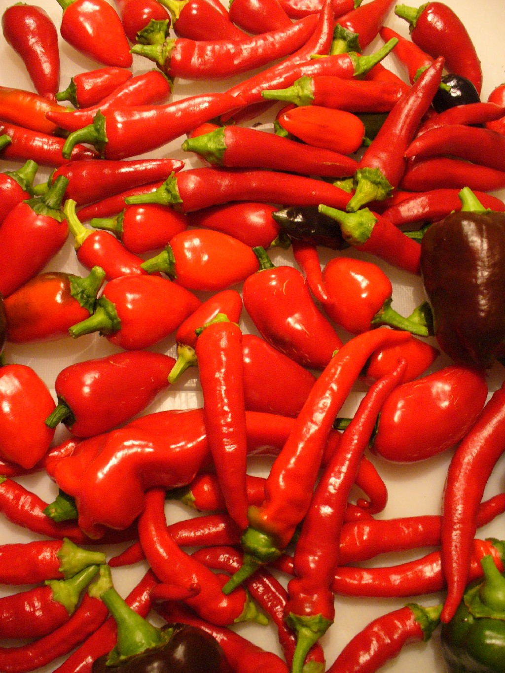 Es ist eine Menge Zeit vergangen seit dem letzten Eintrag. Um das Jahr 2008 abzuschließen, hier noch ein paar schöne Erntebilder Ende der Saison 2008. Ende Oktober, Anfang November haben wir die letzten Schoten vor dem Frost geerntet. Wie auch im letzten Jahr waren dies vornehmlich verschiedene Habaneros.